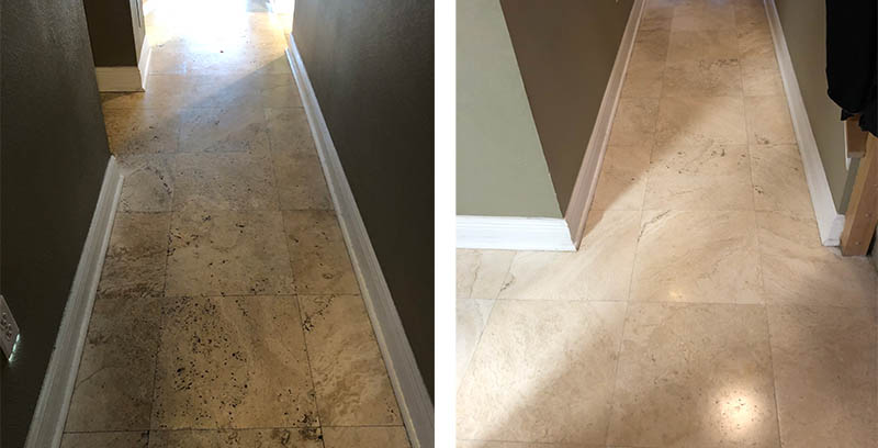 Many travertine floors experience the factory fill popping out over time especially in high traffic areas. Our travertine repair experts refill these holes with a travertine colored epoxy during the restoration or maintenance service. Most scratches and deep etches are removed with a diamond grinding and honing process in which the travertine is refinished revealing a fresh new layer of the stone.